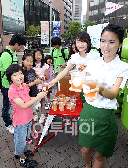 SK텔레콤이 신규 '콸콸콸 smarT 캠페인' 런칭을 맞아 16일 명동거리에서 '안드로보이와 함께하는 콸콸콸 스마티(smarT) 무료음료 이벤트'를 하며 어린이들에게 음료를 나눠주고 있다.