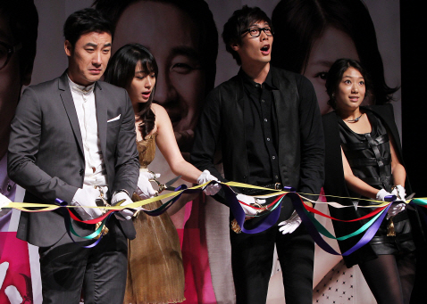 16일 오전 서울 중구 정동에 위치한 이화여자고등학교 100주년기념관에서 열린 영화 '시라노 연애조작단'(감독 김현석) 제작보고회에서 엄태웅(왼쪽)을 비롯한 배우들이 테이프 커팅을 하다 축포 소리에 놀라고 있다.