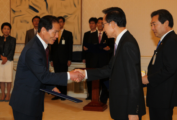 이명박 대통령이 16일 청와대에서 설동근 교육과학기술부 1차관에게 임명장을 주고 있다.