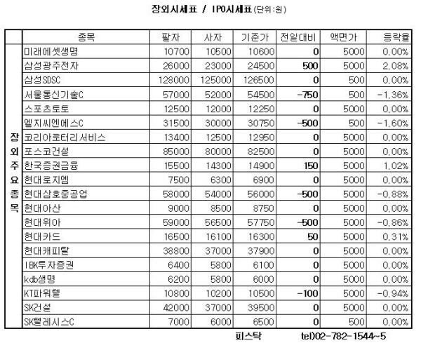 그밖에 롯데홈쇼핑(-1.04%)과 메디슨(-0.83%), 삼성자산운용(-0.40%), 삼성전자서비스(-0.47%), 시큐아이닷컴(-3.09%), LS전선(-0.42%), 세메스(-0.99%)등 장외종목들은 하락마감했다.