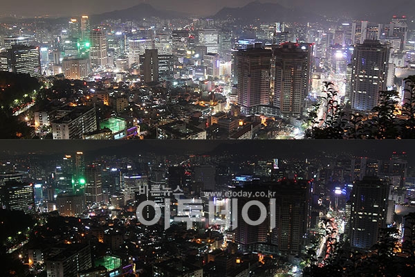 16일 저녁 '제7회 에너지의 날 행사'가 열린 가운데, 저녁 9시부터 5분간 소등에 들어 간 서울광장 주변이 각각 다른 모습을 연출하고 있다. 위 사진은 소등 전 아래사진은 소등 후 서울의 모습.