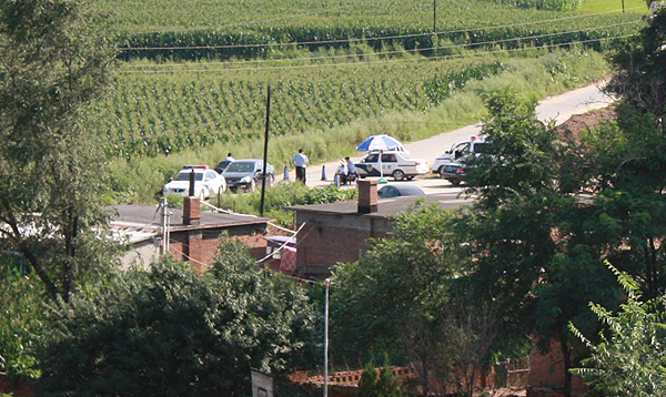 북한 전투기가 추락한 랴오닝성 푸순현 라구향 쑹강촌에서 지난 18일 중국 공안들이 진입도로를 봉쇄한 채 사고 현장 출입을 엄격하게 통제하고 있다