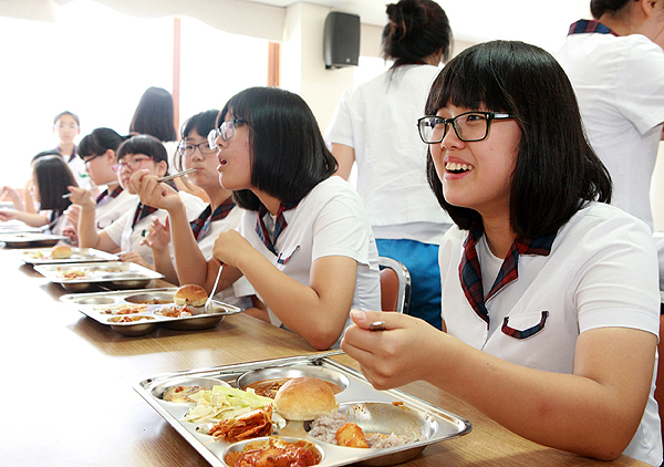 강원 정선군(군수 최승준)이 19일 정선중.고등학교를 시작으로 전면 무상급식을 시작한 가운데 학생들이 즐겁게 급식을 먹고 있다. 유치원생에서 고등학생까지 모든 학생에 대한 무상급식은 정선군이 전국에서 처음이다.