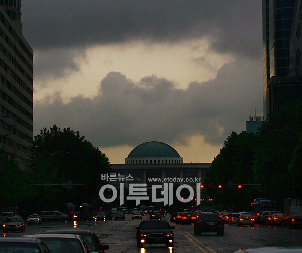 23일 오전 10시 서울 여의도 국회의사당에서 이재오 특임장관 후보자, 조현오 경찰청장 후보자 등 5명의 신임 고위공직자 인사청문회가 진행된 가운데 국회의사당에 먹구름이 끼어 있다.