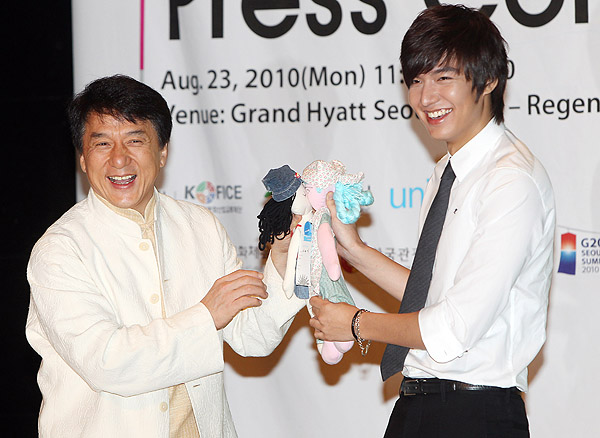 23일 오전 남산 하얏트호텔 리젠시룸에서 열린 유니세프와 함께하는 제7회 아시아송페스티벌 기자회견에서 명예조직위원장으로 위촉된 홍콩 배우 청룽(成龍.56)과 유니세프 홍보대사인 배우 이민호가 직접 얼굴을 그린 아우인형을 들고 포즈를 취하고 있다.