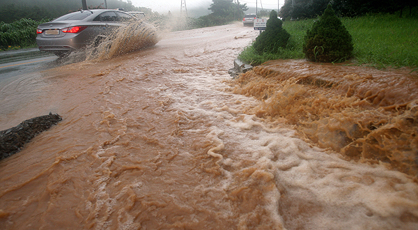 23일 충남 태안에 시간당 174mm의 집중호우가 쏟아진 가운데 원북면 청산리 도로에 빗물이 흘러들고 있다.
