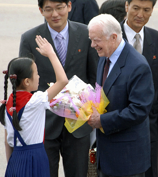 지미 카터 전 미국 대통령이 25일 오후 전용기편으로 평양 공항에 도착, 환영의 꽃다발을 받고 있다.