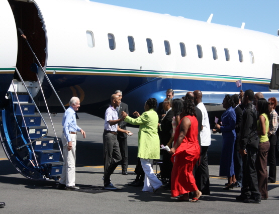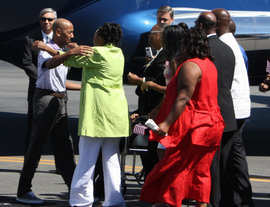 북한에 수감돼 있던 미국인 아이잘론 말리 곰즈(31)씨와 그의 석방을 위해 평양에 갔던 지미 카터 전 미국 대통령 일행이 27일 오후(현지시간) 미국 보스턴의 로건 공항을 통해 귀환했다. 사진은 카터 전 대통령이 지켜보는 가운데 곰즈가 공항에서 가족친지들과 포옹하며 재회하는 모습 (사진=연합뉴스)