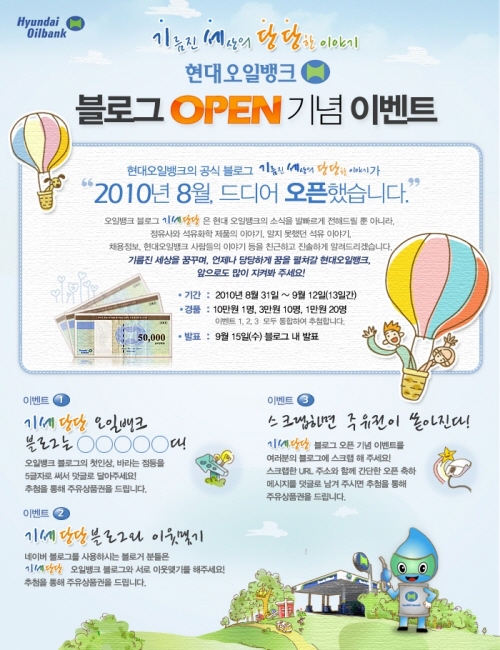한편 현대오일뱅크는 다음달 12일까지 블로그 오픈 이벤트를 진행한다. 오픈 이벤트에서는 현대오일뱅크 블로그와 이웃맺기를 신청하거나 블로그 오픈을 자신의 블로그에 게시해 홍보하면 추첨을 통해 주유상품권을 지급한다.