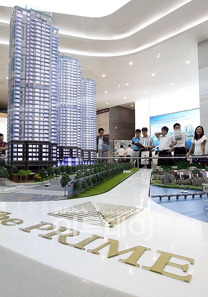동아건설이 서울 용산에서 처음으로 분양가 상한제가 적용된 주상복합아파트 '용산 더 프라임'을 선보였다. 정부의 DTI(총부채상환비율)규제를 완화 덕분인지 30일 오후 서울 용산구 한강로3가 견본주택에 많은 사람들이 몰려있다.