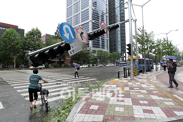 강한 비와 바람을 동반한 제7호 태풍 곤파스의 영향으로 2일 아침 여의도 부근의 신호등이 휘어져 고장나 있다.