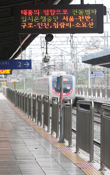 태풍 곤파스가 한반도를 강타한 2일 오전 국철 1호선이 단전으로 인해 전면 운행중단됐다. 서울 노량진역에 인천행 열차가 멈춰서 있다.