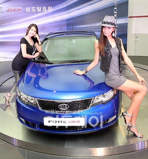 기아자동차(주)가 '포르테 GDI' 출시와 함께 '포르테 해치백' 모델을 출시한 가운데 2일 오전 압구정동 기아자동차 영업본부에서 '포르테 GDI' 보도발표회를 가졌다. 모델들이 포르테 해치백과 함께 포즈를 취하고 있다.