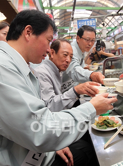 최태원 SK그룹 회장이 7일 오전 종로광장시장에서 열린 '미소금융 활성화를 위한 스마트폰 어플리케이션 및 넷북 전달식'을 마친후 김승유 미소금융중앙재단 이사장, 정만원 SKT 사장 및 관계자들과 막걸리를 마시며 이야기를 나누고 있다.