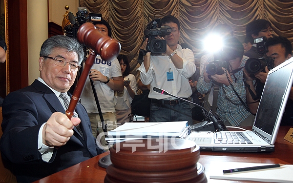 김중수 한국은행 총재가 9일 오전 소공동 한국은행 본관에서 열린 금융통화위원회에서 회의 시작을 알리는 의사봉을 두드리고 있다.