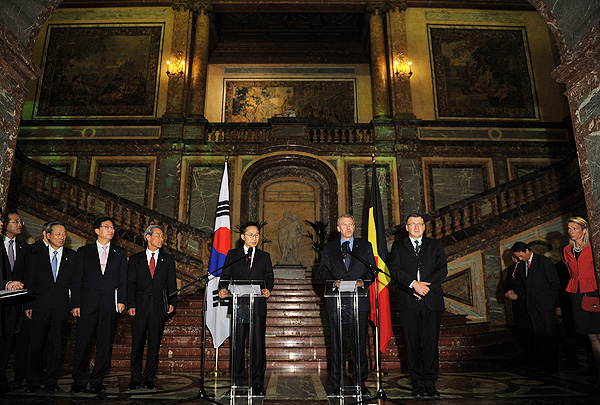 이명박 대통령과 이브 레테름 벨기에 총리가 5일 오후(현지시간) 브뤼셀 에그몽궁에서 정상회담을 마친뒤 공동기자회견을 하고 있다.