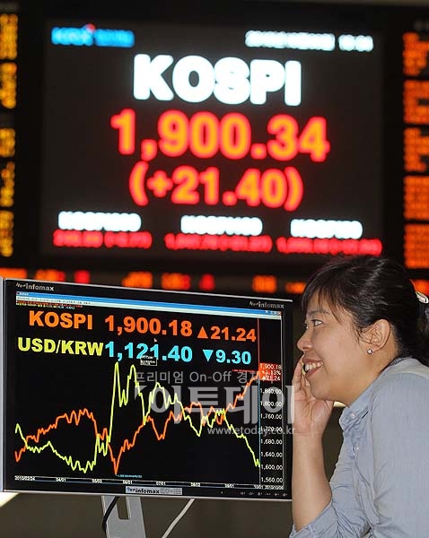 코스피지수는 6일 오전 10시9분 현재 전일대비 21.36포인트(1.14%) 뛴 1900.30을 기록했다. 코스피지수가 1900선에 오른 것은 지난 2008년 5월19일 1901.13을 기록한 이후 2년 5개월만의 일이다.