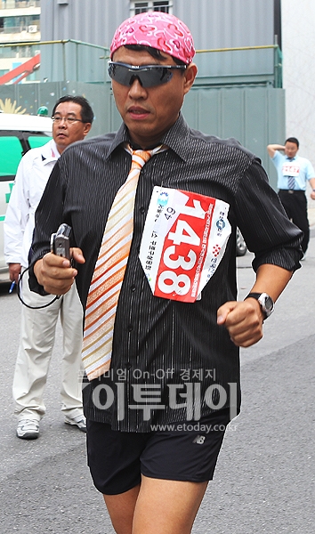 8일 오후 구로 디지털단지 마리오타워 광장에서 '제 8회 전국 벤처인 넥타이 마라톤 대회'가 열린 가운데 한 참가자가 즐겁게 달리고 있다.