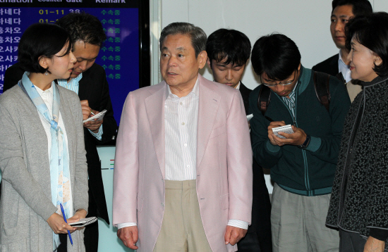 20~24일 멕시코 아카풀코에서 열리는 세계국가올림픽총연합회(ANOC) 총회에 참석하기 위해 출국하는 이건희 삼성전자 회장이 12일 오후 서울 김포공항에서 기자들의 질문에 답하고 있다(사진=연합뉴스).