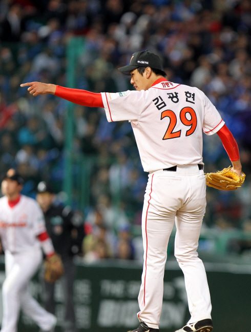 15일 인천 문학경기장에서 열린 2010 프로야구 한국시리즈 1차전 SK와 삼성 경기. 선발등판한 SK 김광현이 1회초 1사 주자없는 상황에서 삼성 김상수를 삼진으로 잡고 손가락으로 홈쪽을 가리키고 있다.