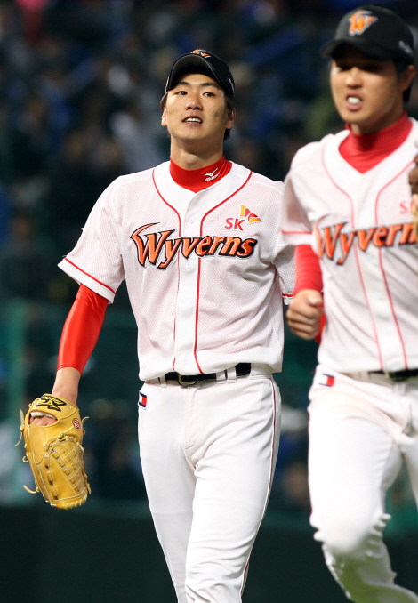 15일 인천 문학경기장에서 열린 2010 프로야구 한국시리즈 1차전 SK와 삼성 경기. SK 선발 김광현이 2회초 삼성 공격을 막아낸 뒤 밝은 표정으로 더그아웃으로 들어가고 있다.