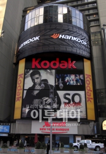 회사측은 미국 뉴욕 맨해튼의 최대 번화가인 타임스퀘어 중심부에 있는 건물 외벽을 거대한 타이어 모양으로 장식했다고 밝혔다.