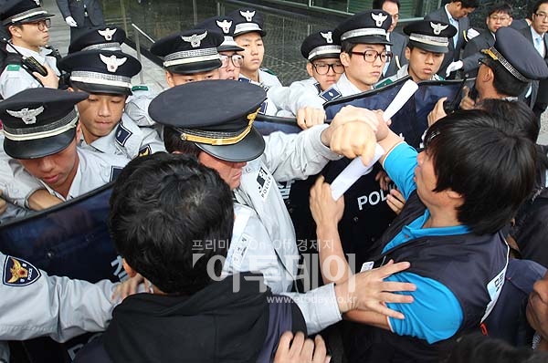 19일 여의도 산업은행 본점에서 국정감사 방청을 요구하는 전국금속노동조합 쌍용자동차지부와 이를 저지하는 경찰이 몸싸움을 벌이고 있다.