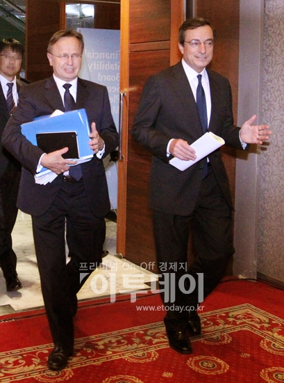 마리오 드라기 FSB의장(오른쪽)과 스베인 안데르센 FSB사무총장이 20일 저녁 삼성동 코엑스에서 금융안정위원회(FSB)회의를 마치고 기자회견을 위해 입장하고 있다.