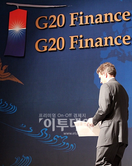 티머시 가이트너 미국 재무장관이 23일 오후 경주 현대호텔 미디어센터에서 열린 공식 기자회견을 끝내고 자리를 이동하고 있다.
