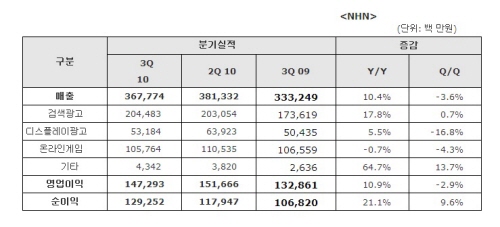 한편, 자회사를 포함한 NHN의 3분기 연결 실적은 4086억원을 기록했으며 영업이익은 1541억원, 순이익은 1293억원을 기록했다.