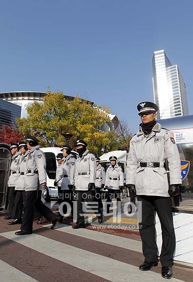서울 G20 정상회의가 개최되는 11일 오전 서울 삼성동 코엑스 주변으로 경찰들이 순찰업무를 보고 있다.
