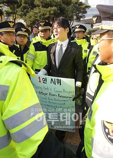 서울 G20 정상회의가 개최되는 11일 오전 서울 삼성동 코엑스 주변에서 4대강 사업 반대 1인 시위에 나선 한 시민이 경찰차로 이송되고 있다.