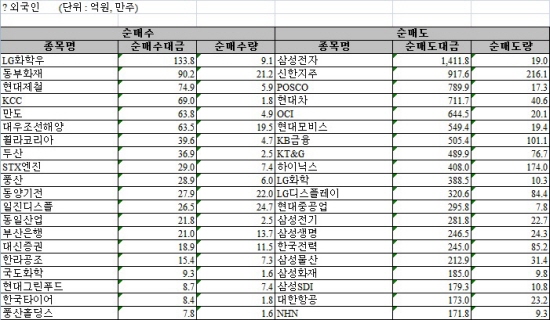 반면 LG화학우(133억원)와 동부화재(90억원), 현대제철(74억원), KCC(69억원), 만도(63억원) 등은 순매수했다. LG화학우는 외국인의 '사자' 물량이 몰리면서 3.61% 상승했다.