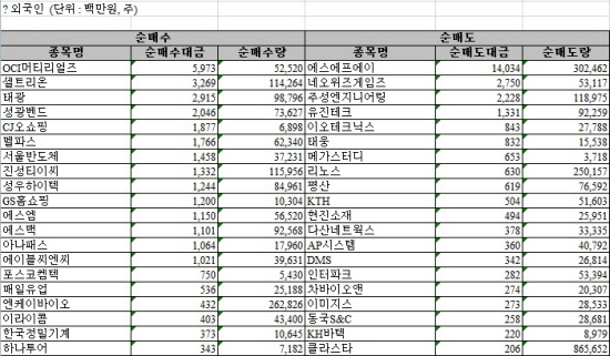 반면 에스에프에이(140억원)와 네오위즈게임즈(27억원), 주성엔지니어링(22억원), 유진테크(13억원), 이오테크닉스(8억원) 등은 순매도했다. 에스에프에이는 신규시설투자 결정 철회 소식에 외국인들의 실망매물이 쏟아지며 7.79% 하락했다.