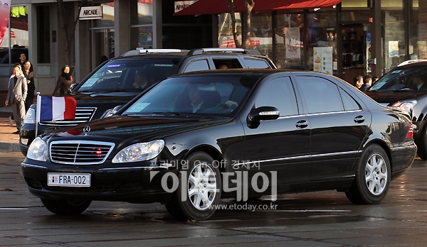 서울 G20 정상회의로 코엑스 주변 교통이 통제된 12일 오전 프랑스 의전차량이 경호를 받으며 회의가 열리는 삼성동 코엑스로 향하고 있다.