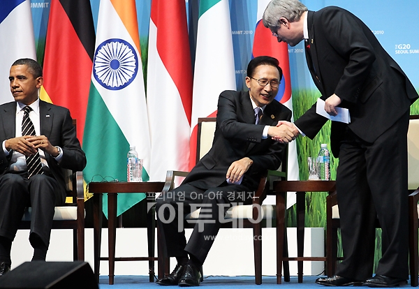 이명박 대통령과 스티븐 하퍼 캐나다 총리가 12일 오후 삼성동 코엑스에서 열린 ‘G20 중소기업 자금지원 경진대회’시상식에 참석해 악수를 나누고 있다.
