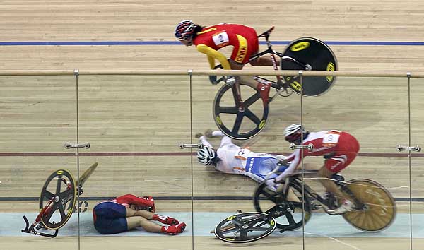 16일 광저우대학타운 벨로드롬에서 열린 아시안게임 여자 20㎞(80바퀴) 포인트 레이스 결승에서 선두권을 달리던 나아름 선수가 경기 도중 경쟁 선수와 부딪혀 트랙에서 넘어지고 있다.흰색 복장이 나아름 선수.
