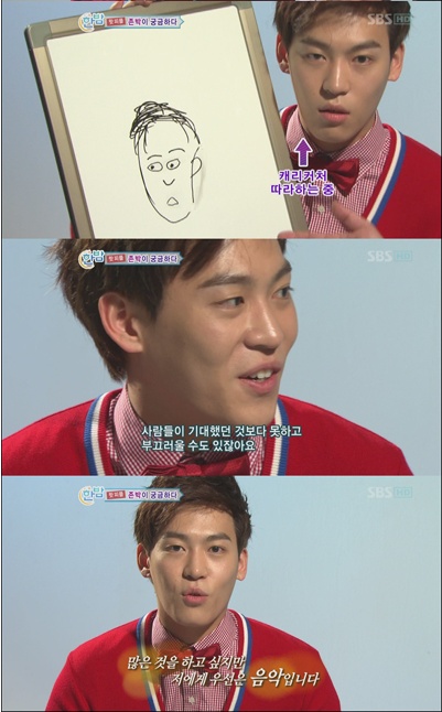 그는 먼저 최근 인터넷상에 화제가 되고 있는 존박과 캐리커처에 대해 입을 열었다. 그는 “제 케러커쳐 점수는 99점” 이라며 매우 흡족해했다. 무엇보다 의외로 멍한 모습을 자주 들켰던 존박은 자신의 멍한 모습과 그림을 비교하기도 하고 직접 속성으로 자신의 캐리커처를 그리는 방법을 전수해 주기도 했다.