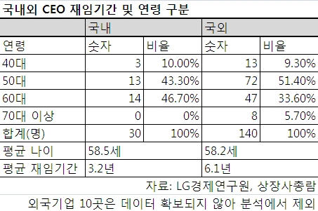그렇다면 CEO들의 적정 연령 수준은 몇 세일까. 이에 이투데이는 LG경제연구원의 자료와 함께 국내외 CEO들의 연령과 재임기간을 비교 분석해 봤다.