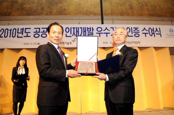 '인재개발 우수기관 인증제'는 능력 중심의 인재를 채용하고 지속적인 교육훈련의 시스템을 갖춘 인적자원개발 활동이 우수한 기관을 평가해 교육과학기술부와 행정안전부가 공동으로 인증하는 제도로서 3년마다 실시한다.