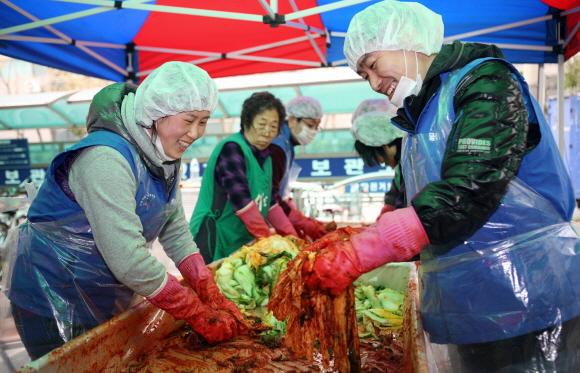 ▲삼성물산 직원들이 강남구 수서동 주민센터에서 김장담그기 행사를 펼치고 있다.