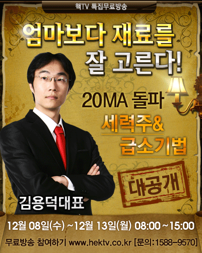 이런 김용덕대표의 자신감은 12월10일(금요일) 진행되는 핵TV(www.hektv.co.kr) 장중 특집방송에서 3개월여 이어져 온 수익률 신화를 굳건히 다지겠다는 강한 의지가 내포되어 있다. 짧게는 2박3일의 스윙에서 길게는 3개월 단기 기간매매를 주특기로 하고 있는 김용덕대표는 ‘월 20%수익 현실화’를 보여준 최초의 증권 전문가다.