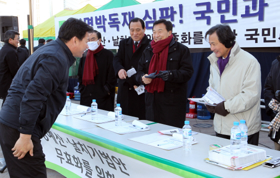 민주당 손학규 대표 등 의원들이 11일 서울광장에서 `4대강예산.날치기법안 무효화'를 위한 대국민서명운동을 벌이고 있다.