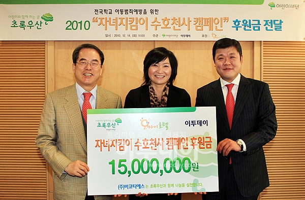 프리미엄 석간 경제지 이투데이와 어린이재단이 공동 주최하는 ‘자녀지킴이 수호천사 캠페인’ 후원금 전달식이 14일 서울 중구 무교통 어린이재단에서 열렸다. 이날 전달식에서 여행전문 기업인 (주)비코티에스는 어린이재단에 후원금 1500만원을 기부했다. 사진은 김상우 이투데이 대표이사겸 발행인·편집인(오른쪽), 이미순 (주)비코티에스 대표이사(가운데), 이제훈 어린이재단 회장이 기념촬영을 하고 있다.