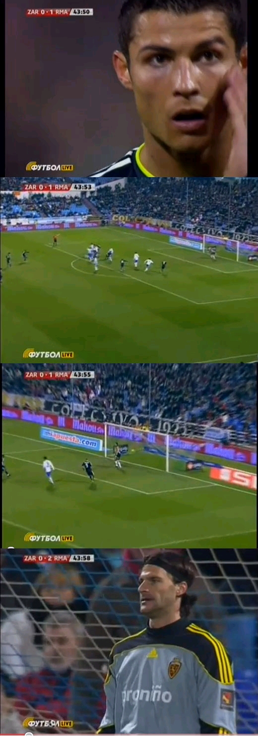 13일(한국시간) 스페인 사라고사의 라 로마레다 스타디움에서 열린 프리메라리가 15라운드 레알 사라고사와 경기에서 호날두는 전반 43분 105km에 이르는 무회전 프리킥으 그림 같은 프리킥을 성공시켰다.
