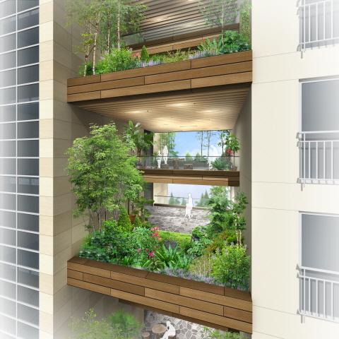 엘리베이터와 각 세대 사이 공용공간을 활용해 전원주택의 마당을 아파트로 옮겨왔다. 특히 홀수층과 짝수층의 조경공간 위치를 각 각 반대로 배치해 높은 층고를 확보, 키 큰 나무도 심을 수 있으며 전 층이 외부로 노출돼 있어 사계절 변화를 앞마당에서 그대로 느낄 수 있다. 세대별 마당은 유모차나 자전거를 보관하는 공간으로도 활용할 수 있다.