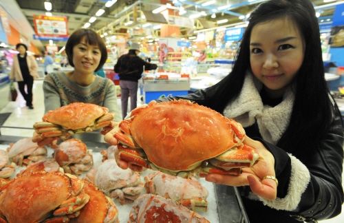 홈플러스 영등포점은 21일 연말 특수를 맞아 알래스카에서 직송한 하트 모양의 '러브크랩(원명;던진니스 크랩)'을 유통업체 단독으로 선보였다. 미국, 캐나다, 유럽 등지에서 매우 인기가 높은 러브크랩은 국내산 꽃게에 비해 3~4배 크고 살도 꽉 차 있다는 것이 특징.
