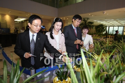 ▲우리은행 본점 로비에서 21일 실시한 임원 취임 축하화분 공매 행사에서 우리은행 직원들이 경매에 참가 할 난을 고르고 있다. 우리은행은 수익금 전액을 사회복지단체에 전달 할 예정이다.