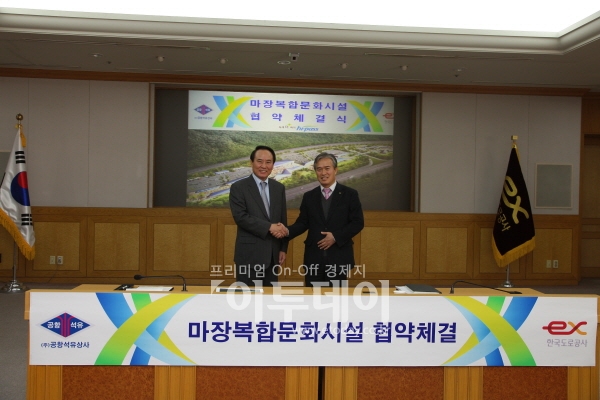 SK에너지는 24일 한국도로공사에서 최윤환 한국도로공사 사업본부장, 송진수 공항석유 대표, 차규탁 SK에너지 내트럭사업부장 등 관계자 50여명이 등이 참석한 가운데 마장분기점 복합문화시설 사업자 선정 체결식을 맺었다고 밝혔다.