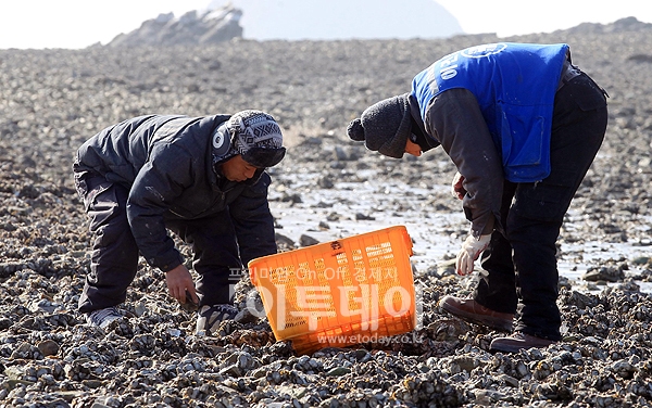강풍과 함께 추위가 몰려온 24일 오후 인천시 옹진군 연평도 앞바다는 추위에도 불구하고 굴을 채취하기 위한 주민들이 바쁘게 움직이고 있다.